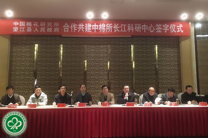 李付广对望江县委、县政府长期以来的大力支持表示感谢。他指出,我所近20年在望江基地培育了国审或省审棉花新品种达10多个,其中中棉所63连续多年被农业部列为长江流域主推品种,这表明望江具有典型的长江流域生态农业气候,适宜开展农业科学研究。李付广表示,双方合作共建“中棉所长江科研中心”,标志着双方全面战略合作正式拉开序幕。望江县是植棉大县、纺织服装产业集群,科研中心不仅仅以培育品种为主,更重要的是为地方纺织服装企业提供服务,科研中心将密切联合国家棉花产业联盟,建设成“科研—生产—加工—流通—纺织—服装”全产业链一体化服务平台,逐步打造成为规模化、机械化的优质棉生产基地,实现“优质棉订单农业”,进而为望江县的纺织服装产业的健康快速发展做出应有的贡献。他强调,希望双方共同努力,不断完善健全合作机制,加强科研中心业务实力,最终实现双方互惠共赢。