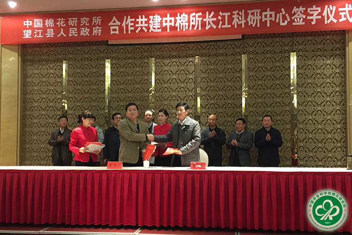 2016年11月9日,我所与望江县人民政府举行签约仪式,所长李付广和望江县县长霍辉代表双方签订合作共建“中棉所长江科研中心”协议。签约仪式由望江县副县长徐四新主持。