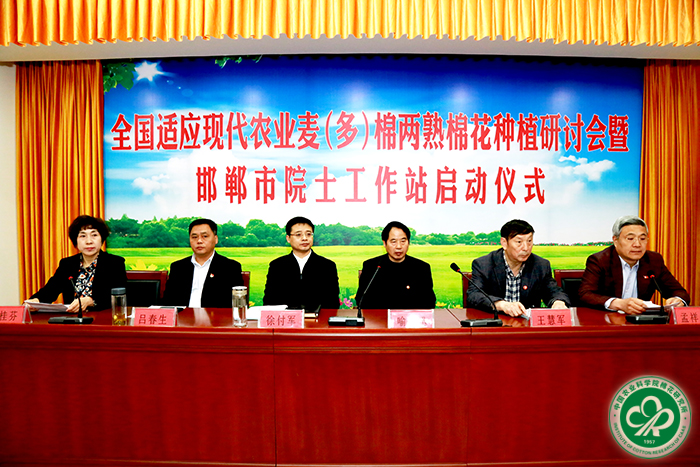 2017年4月13日,我所在河北省邯郸市组织召开全国适应现代农业麦(多)棉两熟棉花种植研讨会暨邯郸市院士工作站启动仪式。我所喻树迅院士、党委书记吕春生、党委副书记宋国立,毛树春研究员及全国20余位棉花知名专家出席会议。河北省农科院副院长王慧军、邯郸市副市长徐付军、邯郸市农科院院长蔺桂芬等出席。会议由邯郸市农科院承办,邯郸市政府副秘书长孟祥生主持。