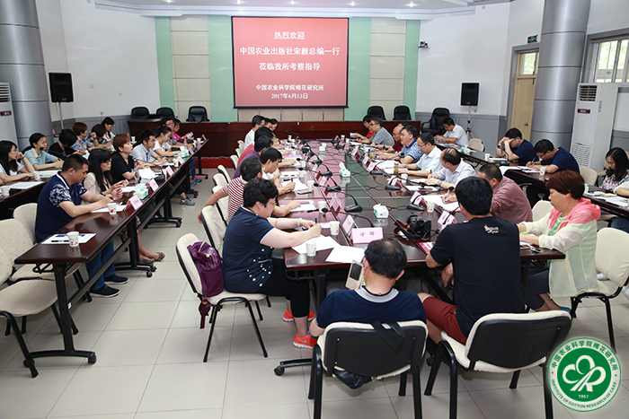 2017年6月13日,中国农业出版社副总编辑宋毅等一行32人来所调研指导,并就著作出版、期刊文章发表及践行中棉所精神等内容进行了座谈交流。我所党委书记吕春生,副所长、党委副书记侯志勇,党委副书记宋国立和部分职能部门、杂志社负责人及科研代表等参加。会议由宋国立主持。