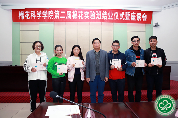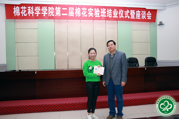 会上,李付广介绍了棉花科学学院成立的背景和战略意义,为棉花实验班学生分析讲解了世界和我国棉花的历史变迁、产业现状、发展形势,勉励大家积极投身棉花事业,将“棉花梦”更好的融入到实现“中国梦”的征程中。此外,李付广为棉花实验班学生代表颁发结业证书,与大家合影留念,并送上“衣食住行衣为先。棉花是衣的基础,你们是衣的未来。中棉所也是母校,欢迎常回来看看。”的寄语。
