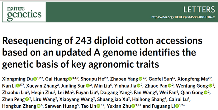 2018年5月7日,由我所李付广团队与杜雄明团队合作,并联合武汉大学、中国农科院深圳农业基因组研究所、安阳工学院等单位的研究人员,在 Nature Genetics在线发表了题为“ Resequencing of 243 diploid cotton accessions based on an updated A genome identifies the genetic basis of several key agronomic traits”的文章。该研究结合群体遗传学,全基因组关联分析和分子生物学等技术,首次从基因组水平上明确了亚洲棉在中国的演化,遗传多样性和群体结构特征,获得了一批重要性状关联的标记和基因,并发现抗枯萎病、生育期等性状受到地理分化的选择。