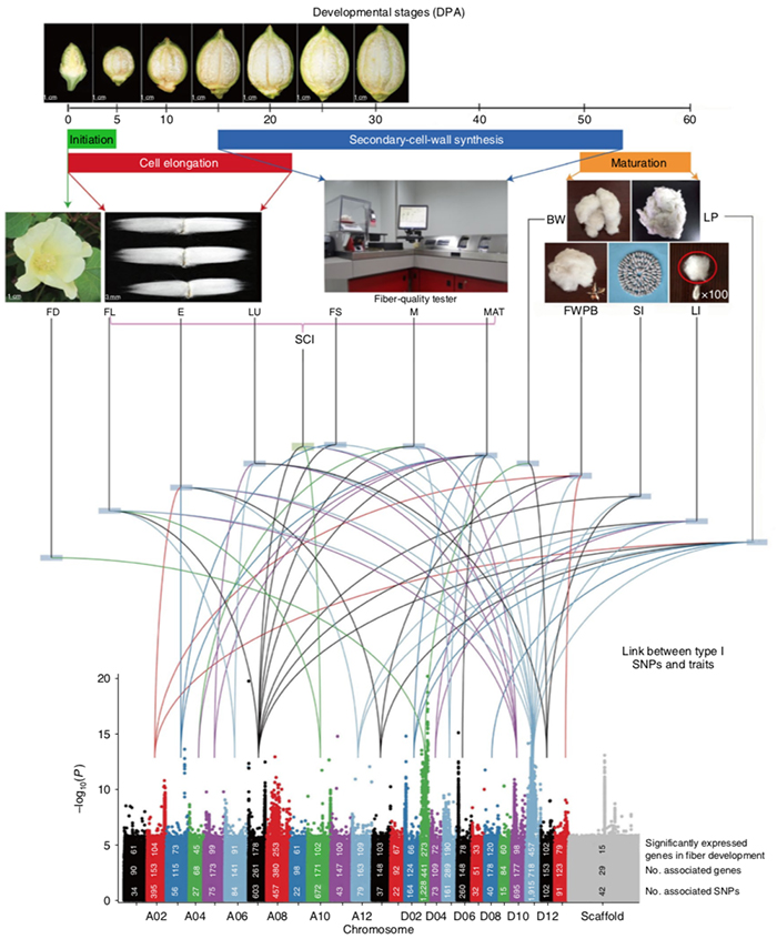 2018年5月7日,《自然遗传学( Nature Genetics)》在线发表了我所杜雄明研究员为通讯作者的题为“ Resequencing a core collection of upland cotton identifies genomic variation and loci influencing fiber quality and yield”的陆地棉研究成果。该研究首次利用我国419份陆地棉核心种质发掘了约366万个SNP标记,对陆地棉核心种质群体的遗传多样性和群体结构进行了系统分析,本研究的主要亮点是完整地搜集了13个纤维相关性状在12个环境中的表现,利用全基因组关联分析(GWAS)发掘了一大批重要性状相关的位点和基因,并对部分关键候选基因进行了功能验证。