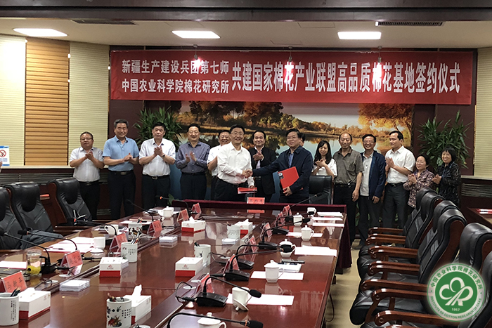 5月28日下午,李付广代表我所与七师师长赵志江签署了《创新驱动发展战略合作协议》,与七师127团政委徐新洲签署了《农业科技示范用地合同》,将联合推进联盟优质棉基地建设;29日现场考察了127团模式园区和胡杨河试验站。
