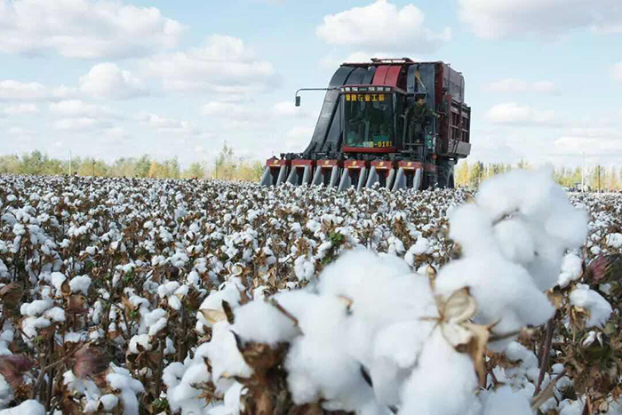 正值收棉季节,新疆棉花采用大规模机械采摘作业。