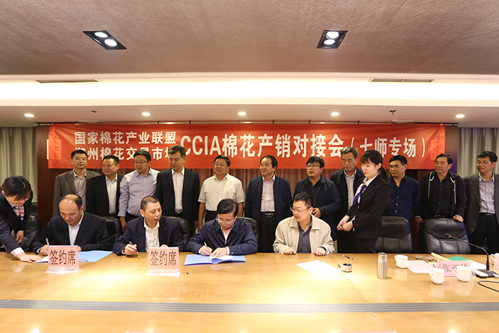 为连通棉花生产、流通、纺织各方,10月17日,国家棉花产业联盟(见证方、平台方)与新疆生产建设兵团第七师(生产方)、郑州棉花交易市场有限公司(贸易方)、河南永安纺织有限公司等10多家大型纺织企业(用棉方代表)4方共同签订了联盟成立以来最大的高品质棉花订单生产、订单销售合同。合同约定,经联盟认证并达到CCIA标准、由七师生产的棉花,全部按照市场价再加价3%-5%进行交易,把“优质优价”落到实处,生产方的利益得到充分保证。这是棉花全产业链从前端生产到中端流通到终端用户“订单生产”的初次探索和成功尝试,为今后联盟机制的完善提供了借鉴。