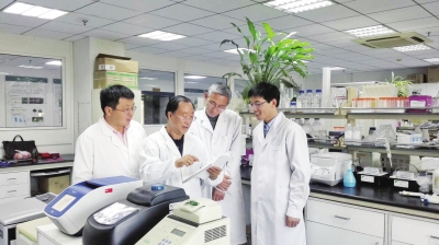 图为郭三堆(左二)在实验室指导助手和学生。资料图