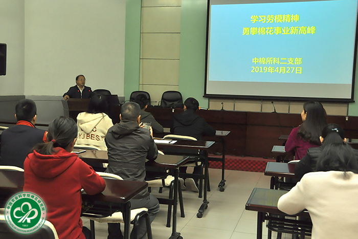 2019年4月27日下午,科研第二党支部举办“学习劳模精神 勇攀棉花事业新高峰”主题党日活动,邀请中国农业科学院优秀党员、安阳市五一劳动奖章获得者杜雄明研究员上党课。