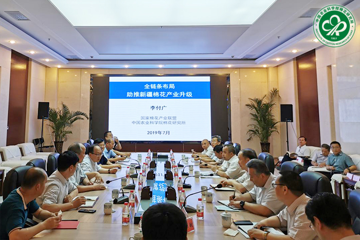 会上,西部中心主任、中棉所所长李付广作了题为“全链条布局 助推新疆棉花产业升级”的报告,详细介绍了中棉所、国家棉花产业联盟实施全产业布局,推动新疆棉花产业升级的情况。西部中心常务副主任刘君璞汇报了中心建设进展及下一步工作计划。艾尔肯对联盟和西部中心取得的阶段性成效给予了充分肯定。