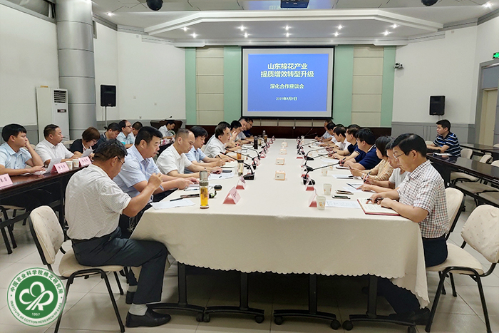 2019年8月5日,山东省棉花生产技术指导站站长王桂峰带领山东省济宁市、滨州市、无棣县、金乡县、夏津县、高唐县农业主管部门负责人及棉花生产合作社、纺织企业代表等一行19人来所就山东棉花产业转型升级提质增效进行调研交流。所长李付广、成果转化处负责人及创新团队专家10余人参加座谈。