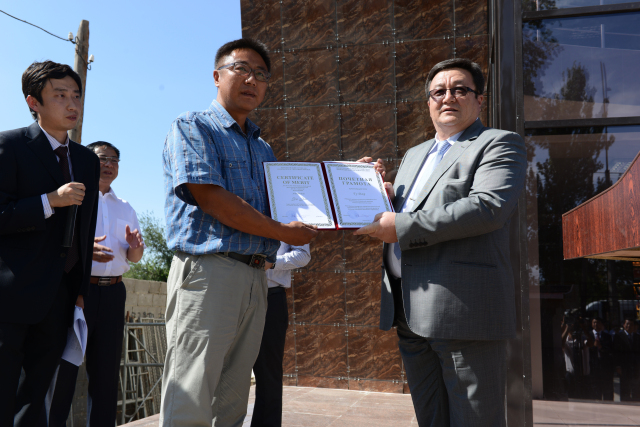 吉尔吉斯共和国农业部部长阿利达拉里耶夫为棉花所技术人员颁发吉尔吉斯农业部最高嘉奖