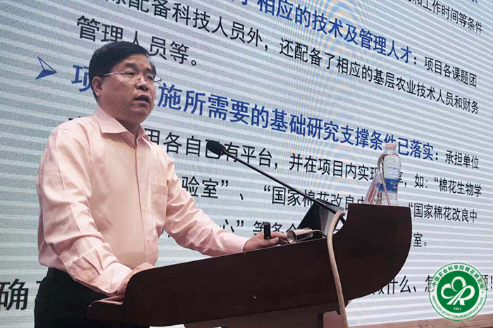 汇报交流会议由农业高技术处处长葛毅强主持,项目主持人李付广从项目管理和支撑配套、项目执行进展、已取得的突出成效、经费使用及存在的问题和建议等方面全面汇报了项目中期执行情况。专家组对项目总体进展给予了肯定,并对项目提出了加大重大成果凝练和规范经费使用等建设性意见建议。棉花产业链相关代表分别作了《CCIA棉花品牌研究与推广,助力中国棉花产业转型升级》《“保险+期货”为高品质棉花保“价”护航》《棉花全产业链布局情况》主题报告,从棉花全产业链进行了典型经验交流。