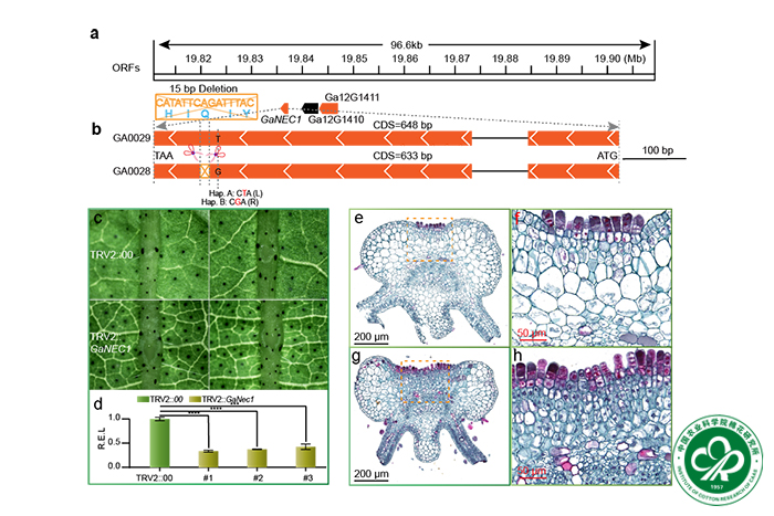 花外蜜腺分布十分广泛,在被子植物100多个科中都有报道,可作为植物间接防御害虫性状,其分泌的蜜汁可以作为食物吸引蚂蚁等互惠动物来对抗食草性昆虫,增加植物—互惠动物适应性,对研究植物—动物互作及抗虫育种具有重要意义。然而花外蜜腺在植物科学中的研究相对薄弱,被称为“植物科学的沉睡之美(TheSleeping Beauty of Plant Science)”。该研究调查了棉属27个种的叶片蜜腺,发现亚洲棉中无蜜腺性状是由自然突变产生。进一步对有/无叶蜜腺棉花材料进行染色体分化情况分析,发现无蜜腺性状受到强烈的自然/人工选择作用,推测无蜜腺性状更适合中国南方和长江流域的农业地理气候。精细定位将候选区间缩小到~96 kb,该区间包含3个基因,其中GaNEC1基因所编码蛋白包含5个氨基酸删除,推测该突变可能引起蛋白质三维结构改变,导致蛋白功能发生改变。该基因受到茉莉酸、茉莉酸抑制剂、乙烯、生长素及伤害诱导,在有蜜腺棉花品种中干涉该基因表达,发现蜜腺细胞的形态发生明显变化,证实该基因参与调控棉花蜜腺发育。构建了蜜腺生长发育的调控网络,发现苯丙烷代谢途径可能在棉花间接防御过程中发挥重要作用,对棉花抗虫育种具有重要意义。