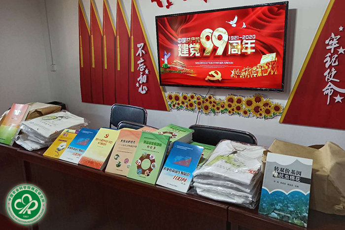 会后,中棉所后勤农场党支部党员代表走访了贫困户,送去了食用油等慰问品,并向郭盆村图书馆赠送农业植保、栽培、转基因方面种类丰富的书籍。(摄影:李保平)
