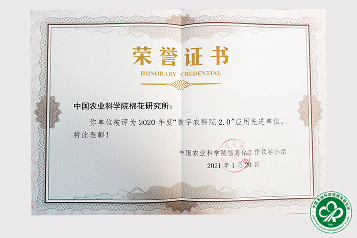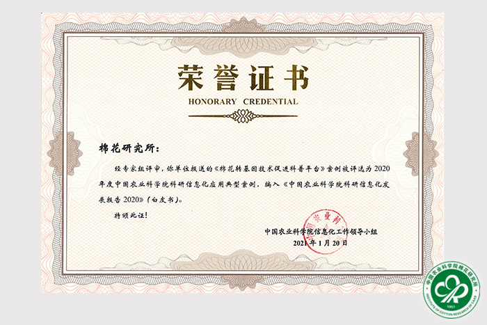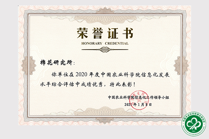 近日,星空体育·(中国)官方网站被评为2020年中国农科院信息化发展水平综合评估优秀单位,排名居全院第5;同时并被评为数字农科院2.0应用先进单位,全院仅8家单位获此殊荣。《智慧棉花云端管理平台》《棉花转基因技术促进科普平台》被评为中国农业科学院科研信息化应用典型案例,编入《中国农业科学院科研信息化发展报告2020》(白皮书)。