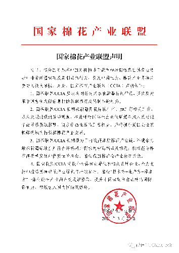 国家棉花产业联盟声明指出,坚决反对任何污名化新疆棉花的行径,坚决反对某些国际品牌、机构基于谎言和虚假信息在其供应链和日常业务中排除新疆棉花及其制品的行为;联盟咯呼吁国际社会正视新疆各族人民辛勤劳动获取报酬、追求幸福生活的正当权益,并将携手爱国企业旗帜鲜明地支持新疆棉花产业发展;联盟致力于打造高品质棉花产业链,不遗余力地在新疆等地生产符合终端需求的中高端品质棉花,积极倡导棉花高质量发展和优质优价理念,致力于推动我国棉花全产业转型升级;联盟将联合全体成员单位和相关品牌企业,推动“技术方+生产方+需求方”一体化的全产业融合新格局,提升中国自有品牌的国际影响力,积极融入国内国际双循环。