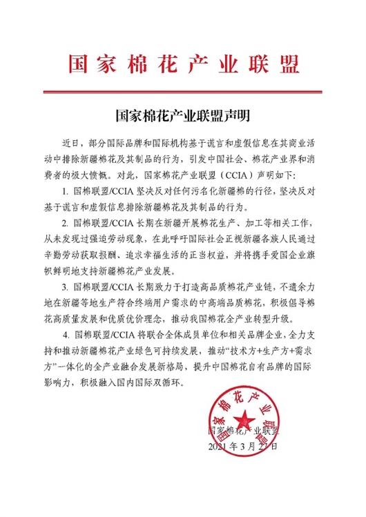 国家棉花产业联盟声明共有四条: