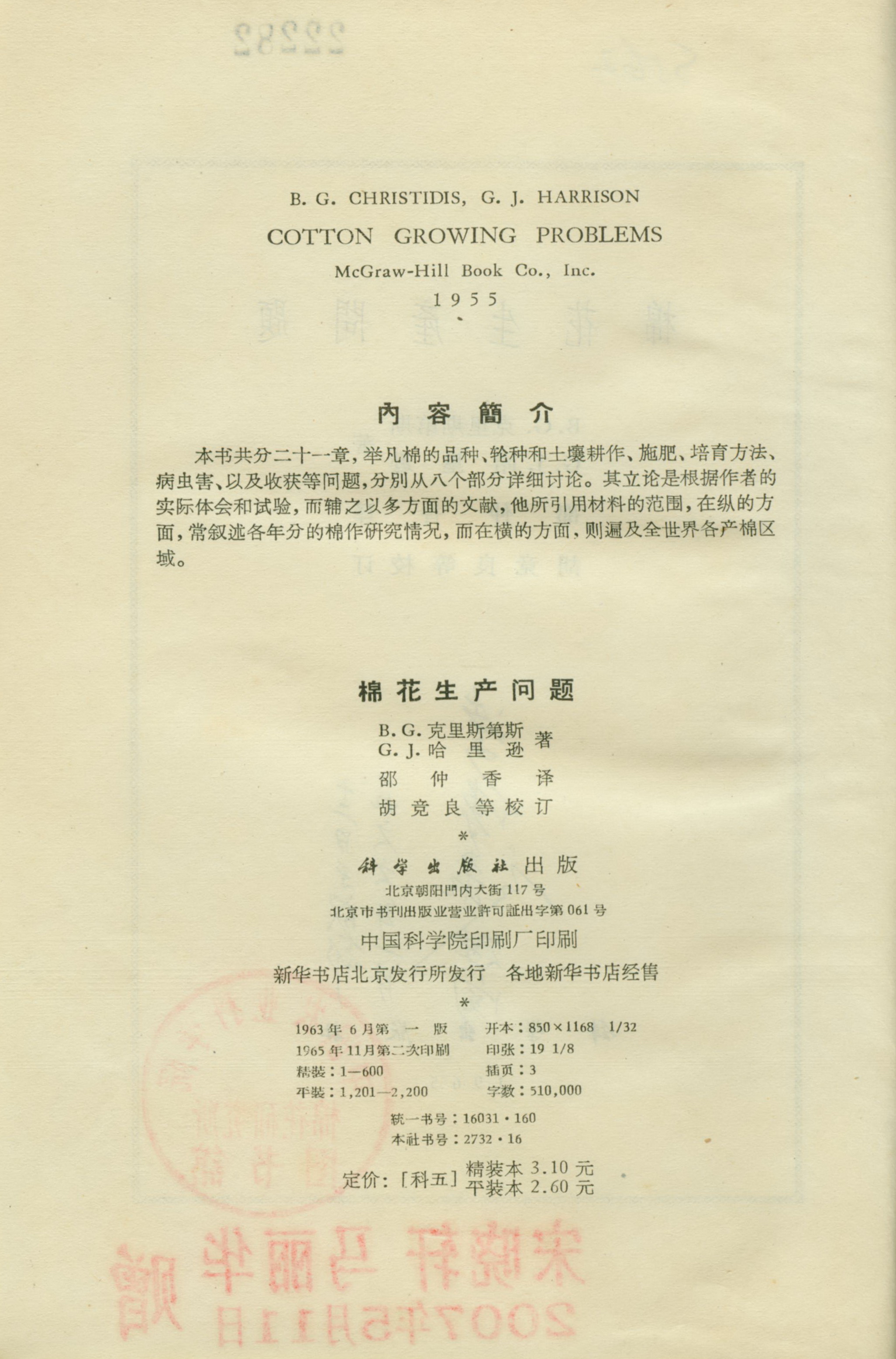 B.G.克里斯第斯、G.J.哈里逊著,邵仲香译,胡竟良等校订,1963年6月科学出版社出版。序言2页,目录2页,正文604页,参考文献3页,51万字。1965年11月第二次印刷,平装和精装。