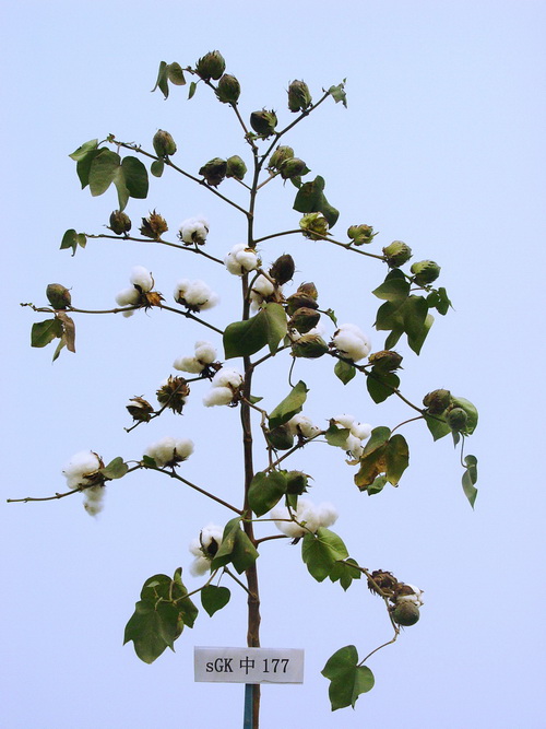 特征特性:双价转基因抗虫常规春棉品种,生育期123天。出苗好,前期长势一般,中后期长势强;植株筒型,稍松散,株高112.6cm,茎杆光滑、韧性好;叶片较大,叶色深绿;结铃性较好;第一果枝节位6.3节,单株果枝数14.0台,单株结铃18.3个,单铃重6.3g,籽指10.9,衣分42.2%,霜前花率 94.4%;吐絮畅,易采摘,纤维色泽洁白。