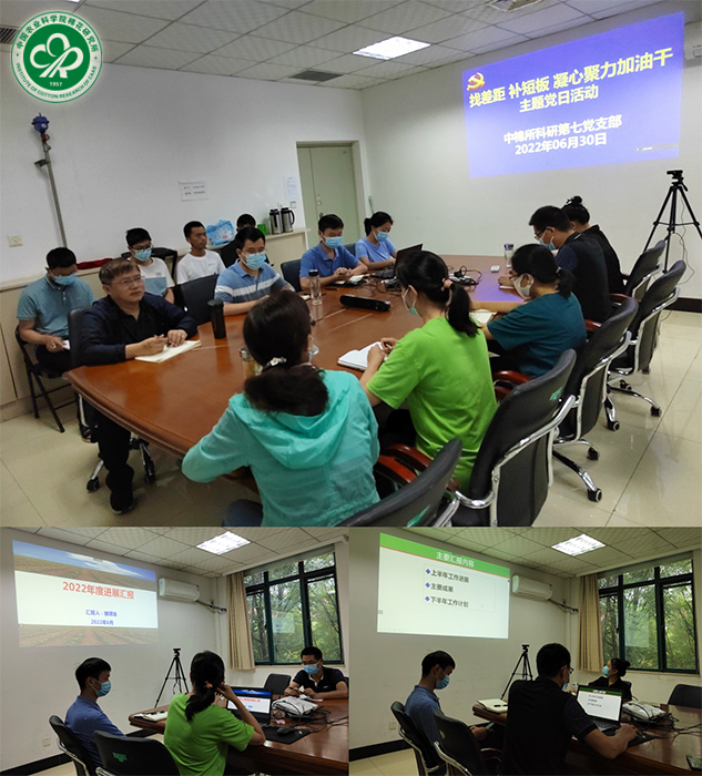 为迎接中国共产党成立101周年,进一步激励党员同志坚定理想信念、凝心聚力、攻坚克难,2022年6月30日,星空体育·(中国)官方网站科研第七党支部以线上线下相结合的形式开展了“找差距 补短板 凝心聚力加油干”主题党日活动暨棉花虫害防控与生物安全创新团队半年工作总结汇报会。支部书记、团队首席崔金杰主持会议,支部党员和团队骨干参加会议。