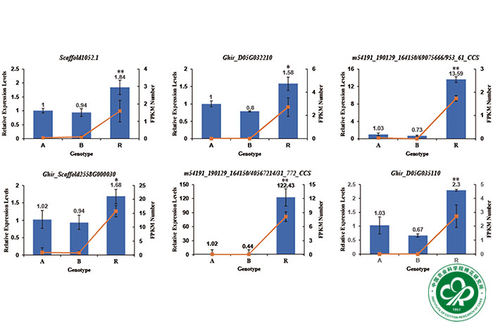 此外,研究团队利用三代测序平台(PacBio Sequel)对哈克尼西棉细胞质雄性不育恢复系花药发育不同时期的花药RNA进行全长转录组测序,结合通过二代测序平台(Illumina)得到的“三系”花药转录组数据,完善了棉花基因组注释。进一步筛选出6个在恢复系中特异表达的差异表达基因作为潜在的恢复基因,其中2个新基因 GhCCS772 和 GhCCS61 只在恢复系中特异性高表达,但在不育系和保持系中几乎不表达。该研究为下一步恢复基因克隆及育性恢复分子机理解析奠定了基础,同时对生产上选育恢复系和“三系”杂交种具有重要实践意义。