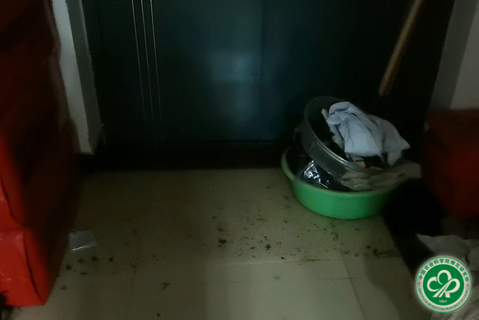 6:10左右,看着不断上涨的洪水水位和消耗殆尽的沙袋,崔金杰在中棉人微信群中求援沙袋。经协调,马雄风通知可以到温室取营养土充当沙袋。正在植保楼内抢险的男青年迅速集结,蹚着没过膝盖的洪水、“漂”着小推车前往温室。在温室中,看到研究所各部门抢险人员和学生们已经在扛起营养土运往所内各处堵水;鉴于温室内空间有限,为提高营养土转运效率,前来拉营养土的几名人员在温室堆放营养土的角落里充当起了“人肉传送带”,一袋袋营养土被转运出去。“后来到温室取营养土的同志越来越多,为了稳住这条运输线,在最里面的我们,只能嘱咐温室外的同志向植保楼多送一点营养土。很快,温室内曾经堆成小山的营养土被‘夷为平地’,我们几个也每人拖起几袋营养土返回植保楼继续封堵。”研究生徐超回忆道。