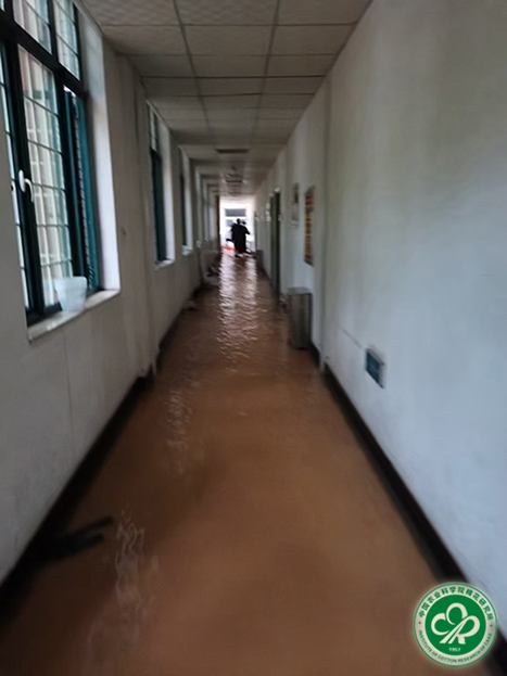 11:24,雨势减小、洪水稍退,植保楼参与抗洪的“战士们”初步清理走廊和房间内的积水后,陆续返回宿舍稍事休息,以迎战可能再来的洪水。