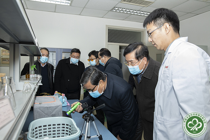 调研期间,武国定走进中棉所与安阳高新区共建的科技成果孵化基地,观看了智慧农业技术和高品质棉花全产业链大数据平台演示,询问了智慧农业技术的相关设备和软件自主研发进展,了解棉花全产业链布局情况。参观了棉花生物学国家重点实验室、中棉所科技成果展厅和转基因实验室,看望慰问了一线科研人员并亲切交谈。