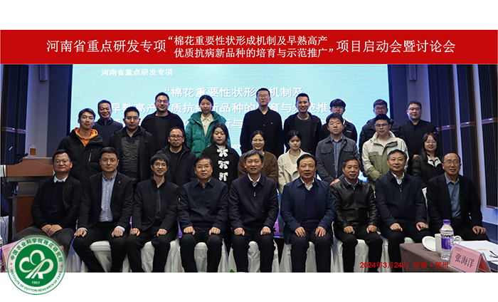 2024年3月24日,由星空体育·(中国)官方网站牵头主持的河南省重点研发专项“棉花重要性状形成机制及早熟高产优质抗病新品种的培育与示范推广”项目的启动会暨交流讨论会在河南郑州召开。专项管理机构河南省科技厅现代农业农村科技处处长李锦辉处长,专项特邀项目咨询专家组成员李培武院士、李付广研究员、汤继华教授、王清连教授、张海洋研究员,中棉所党委副书记、纪委书记宋国立研究员出席会议。承担项目的牵头和课题单位科研财务管理人员以及项目和课题负责人、任务负责人、科研财务助理共计30余人参加会议,会议由中棉所副所长吴建勇研究员主持。