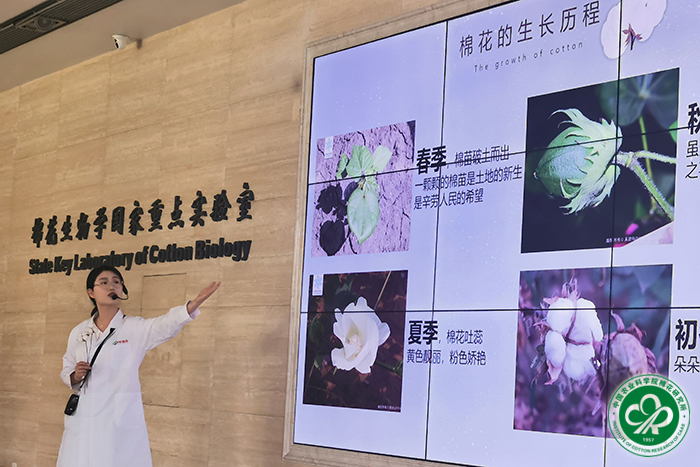 上午九点,集合完毕的小学生们雀跃有序地来到郑州所区一楼大厅,在吴亚杰博士的讲解和带动下,快速燃起对棉花和农业科学的好奇心,开启了一天的研学探索之旅。