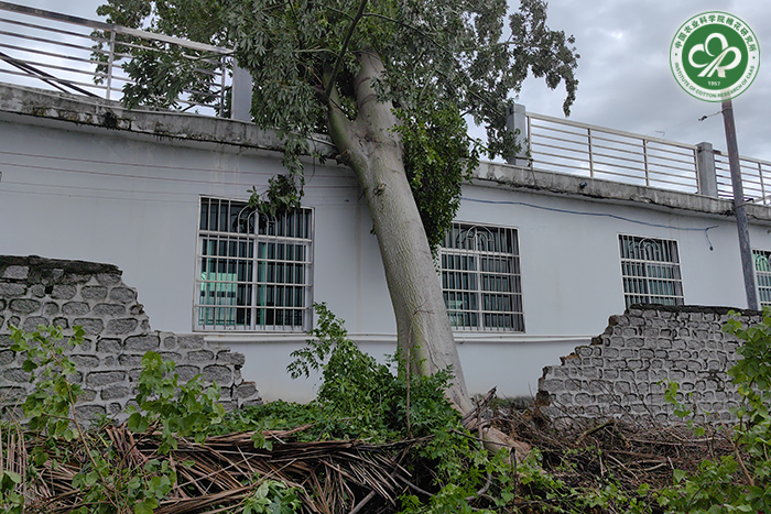 受今年第11号超强台风“摩羯”引发的强风和暴雨影响,国家野生棉种质资源圃的所有野生棉资源几乎全部倒伏,约85株植株高大的木质野生棉被折断或连根拔起;崖城基地食堂后特大木棉树倒伏,压倒围墙约6米,东侧试验地护坡损毁1处约8米;坡田洋基地围栏近300米倒塌;大茅基地和荔枝沟基地未受灾。目前,海南基地已开启灾后重建,着手处理倒伏的木棉树,预留专项资金用于围墙和护坡维修,预计9月中旬完成所有受灾区域的维护维修。