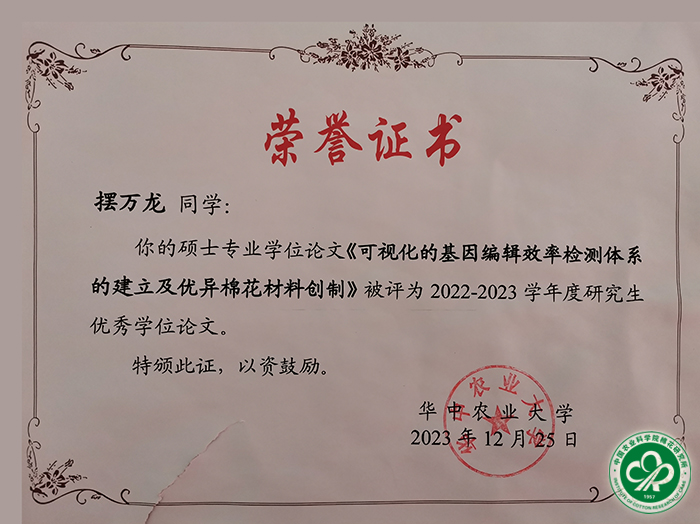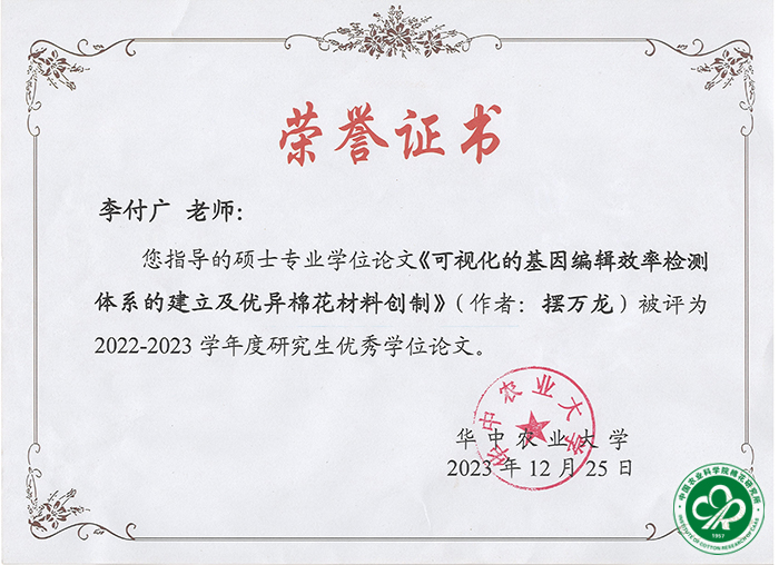 近日,华中农业大学2022-2023学年度优秀学位论文评选结果揭晓,星空体育·(中国)官方网站与华中农业大学联合培养硕士研究生摆万龙的学位论文“建立可视化基因编辑效率检测体系及创制优异棉花材料”荣获表彰,李付广研究员担任指导老师。