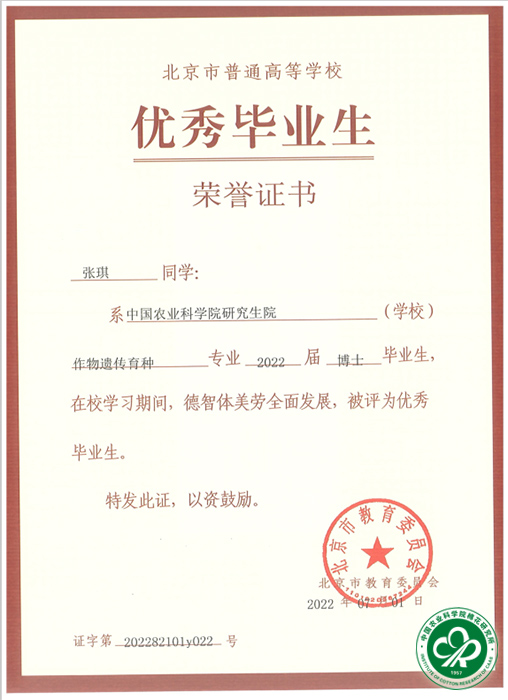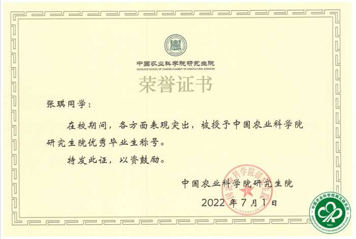 近日,喻树迅院士2019级博士研究生张琪荣获中国农业科学院研究生院2022年度优秀毕业生和北京市优秀毕业生荣誉称号。