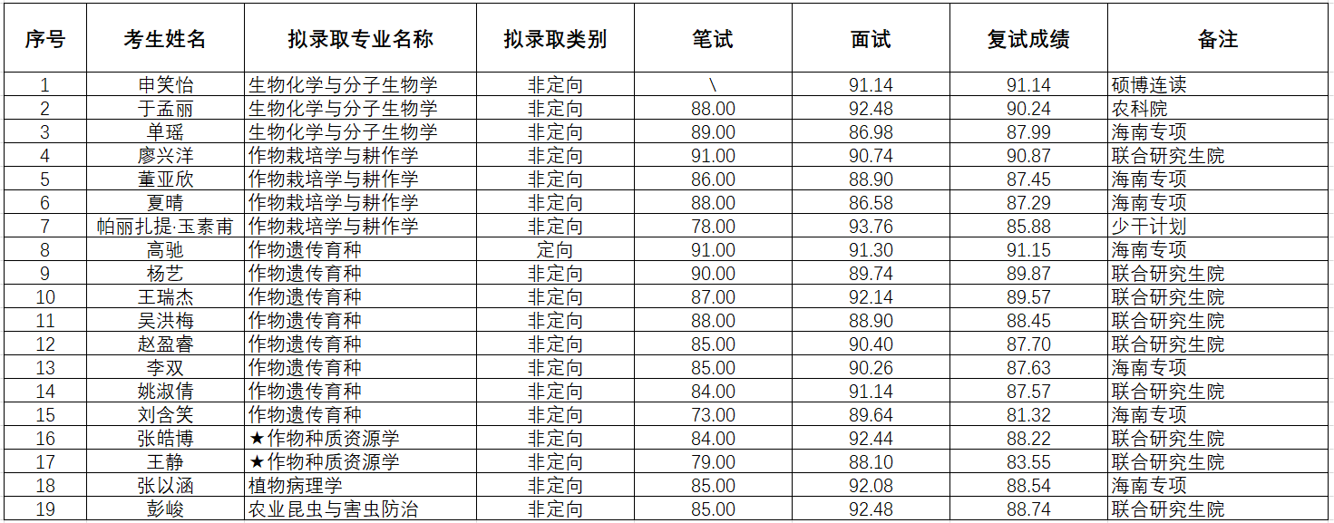 根据《中国农业科学院棉花所2024年博士研究生“申请-考核制”招生实施方案》有关规定及招生领导工作小组会议精神,中棉所已完成2024年博士研究生复试工作,经所党委会议审议通过,拟录取博士研究生19人,按照专业录取成绩从高到低依次排序,现将拟录取人员基本情况公示如下: