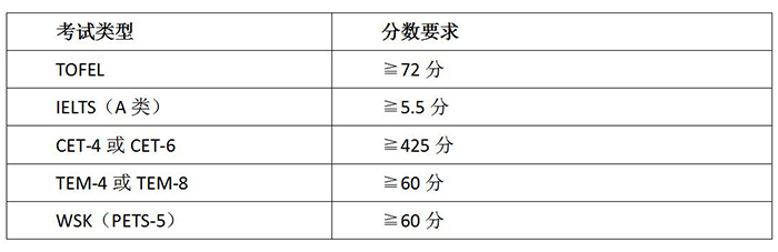 ①参加2015年6月1日之后下列英语水平测试之一的英语考试,成绩达到规定分数,包括TOFEL、IELTS(A类)、全国大学英语考试(CET-4或CET-6)、国家英语专业考试(TEM-4或TEM-8)、全国外语水平考试(WSK,PETS-5),具体分数要求见表1。本科至硕士连续在读的应届生CET-4、CET-6成绩证明不受时间限制。