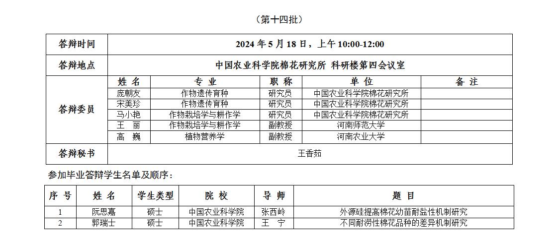 根据《中国农业科学院学位授予工作实施细则》和研究生院论文答辩工作安排,经研究决定,于2024年5月18日进行我所2024年研究生学位论文答辩,具体安排如下: