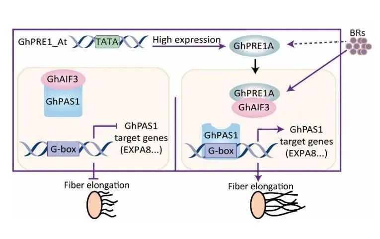 GhPRE1A参与芸苔素内酯信号途径调控纤维伸长的模型
