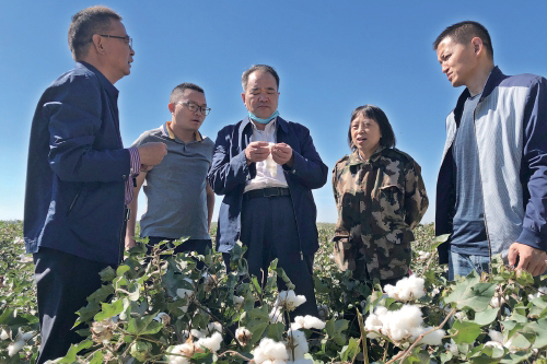 图为张西岭(中)、时增凯(左一)、宋美珍(右二)等专家在新疆昌吉中棉所试验基地考察“宽早优”模式和推广示范的“中棉所113”新品种