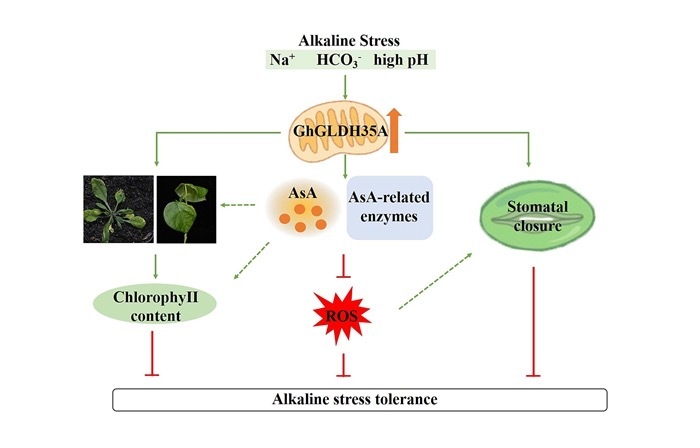 该研究挖掘到抗坏血酸合成的关键基因GhGLDH35A,发现该基因在碱胁迫下表达量显著增加,并通过调控抗坏血酸的合成,维持细胞内的活性氧稳态,从而减轻碱胁迫对棉花的损害。此外,该基因还能够调控气孔运动,减少水分散失,提高棉花的光合作用效率。