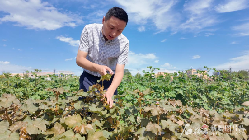 7月12日,西部中心棉花试验田里,杨作仁在查看含有虾青素的工程棉花生长情况。记者张佳煜 摄