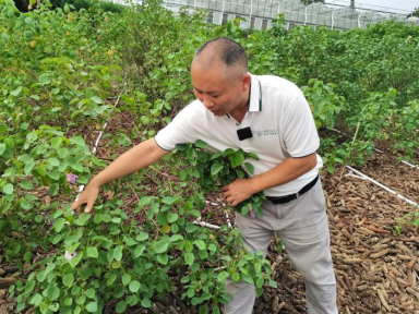在国家野生棉种质资源圃的温室中,中国农科院棉花研究所海南科研中心负责人刘记正在观察野生棉的生长情况。陈楠 摄