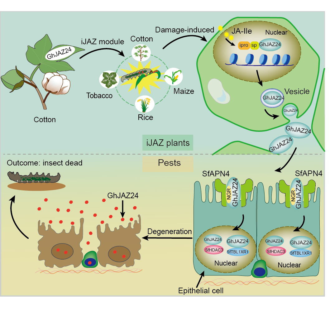该研究在植物组织培养过程中,发现来自同一批次的棉花材料对棉铃虫和草地贪夜蛾表现出增强的抗性。进一步研究发现,该棉花材料的抗虫性状是因GhJAZ24蛋白过表达引起的。为此,研究团队设计了GhJAZ24蛋白的损伤诱导分泌型表达载体,过表达该载体的植物中GhJAZ24蛋白只在害虫取食叶片区域周边细胞诱导表达,而收获的农作物种子或果实则不含GhJAZ24蛋白。