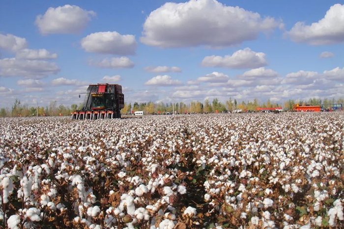 在新疆湛蓝的天空下,采棉机正在采收棉花。(中棉所供图)