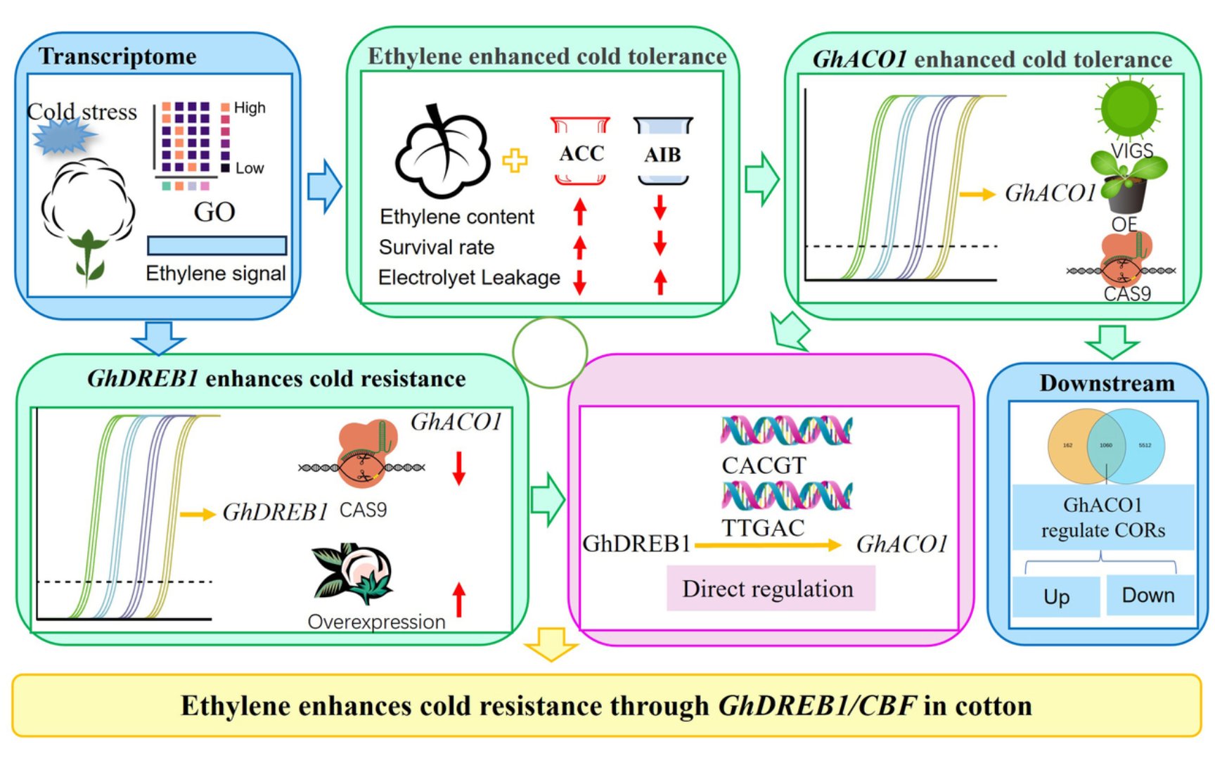该研究发现,乙烯信号通路在棉花低温响应中显著富集,验证了乙烯对棉花耐冷性具有正向作用,并在棉花和烟草中均证实乙烯合成关键基因GhACO1正调控棉花耐冷性。研究进一步发现,C-重复结合转录因子(CBF)受低温胁迫显著表达,且过表达后棉花的耐冷性显著提高,证明了该转录因子能够直接结合在乙烯合成关键基因GhACO1的启动子区域,促进该基因表达。