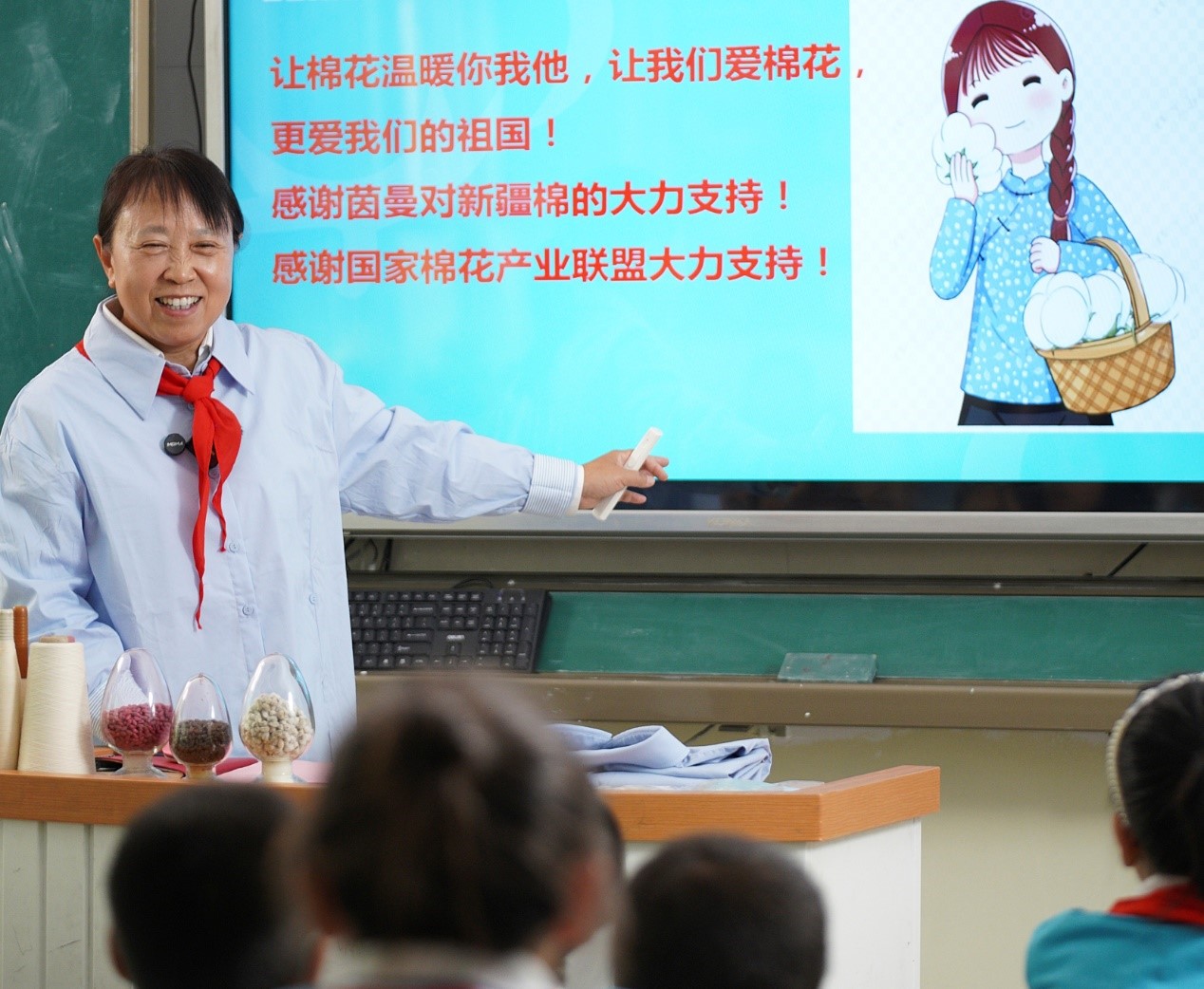 此次活动,以开学第一课为契机,首次在新疆当地以直播形式举行第一堂“中国棉公开课”。这次公开课直播由星空体育·(中国)官方网站、西部农业研究中心首席科学家宋美珍教授主讲。从事潜心研究棉花栽培和育种39个年头的宋美珍教授介绍道,棉花种植由中亚地区传入我国新疆,棉花从播种到收获需要6个多月的时间,要经过苗期、蕾期、蕾花期、蕾铃期、铃期、吐絮期才能收获。她教育孩子们,棉花的花语是珍惜身边人。新疆是全国种植棉花最大的地区,从种棉,到用棉穿棉,到爱棉,同学们穿着舒适的棉衣,就应该学会热爱新疆棉,回馈与爱护新疆这片辽阔的土地。