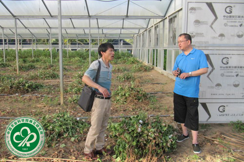 考察中棉所49大茅温室繁育基地(左一 严根土 左二 阿扎提.皮尔多斯)