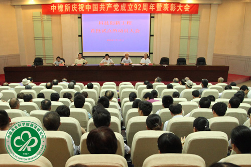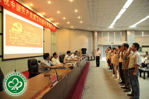 会上,李付广所长回顾了党的92年光辉奋斗历程,给大家上了一堂生动的党史教育课,并就我所进入院科技创新工程第一批试点研究所做了动员讲话。他说,经过近半年的精心准备,我所进入了院创新工程第一批试点单位。这对我所实现跨越式发展和建成世界一流农业科研院所意义深远。今后,将继续制定一系列政策措施,鼓励科研人员多出成果,出大成果,形成真抓实干、求真务实的良好风气,稳步推进我所各项事业向前发展。李所长还对新一届领导班子上任5个月以来的工作进行了总结,他从继续支持中棉种业上市、大力推动西部盐碱旱地棉花发展、加快郑州基地建设、完成安阳县土地置换、制定我所基建发展规划等7个方面进行了介绍。他要求大家抓住机遇,稳步发展,做大做强棉花事业。