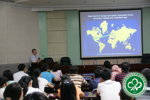 在所期间,Klosterman博士在病害课题组成员的陪同下,参观了老所部病圃、试验农场、棉花生物学国家重点实验室和植物保护研究室实验室,并做了题为“Verticillium wilt in USA and Verticillium comparative and functional genomics”的学术报告,主要介绍了美国黄萎病的发生规律和综合防治技术,以及基于大丽轮枝菌(棉花黄萎病菌)和黑白轮枝菌全基因组测序的比较基因组学和功能基因组的研究进展。Klosterman博士、植保室科研人员及部分留学生进行了座谈,就中美两国黄萎病领域的研究热点进行了广泛交流,并在加强合作研究和人才交流方面达成一致意见。