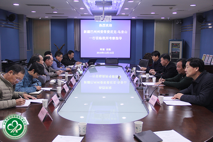 2016年12月15日,新疆巴州州委常委尼克·乌音山一行来我所调研,并就国家棉花产业联盟优质棉示范基地建设等事宜进行座谈交流。会议由副所长张西岭主持。