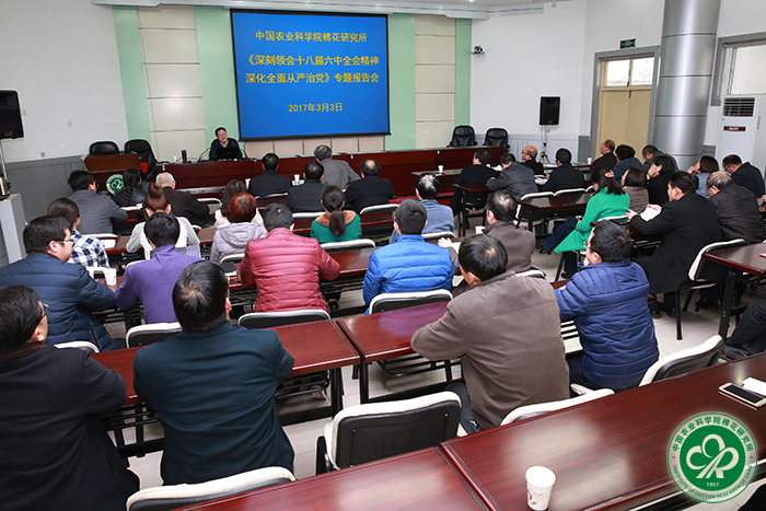 李付广要求,要结合何虎生教授的专题报告,结合工作实际,认真体会,真正做到学用结合,学以致用,用以促学;认真落实全面从严治党的责任,不断提高领导能力,提升管理水平,在创新工程的旗帜下,锐意进取、开拓创新,进一步稳固我所在棉花领域领头羊的地位,努力开创棉花科研事业新局面,全面推进“十三五”发展规划的实施,喜迎党的十九大召开。